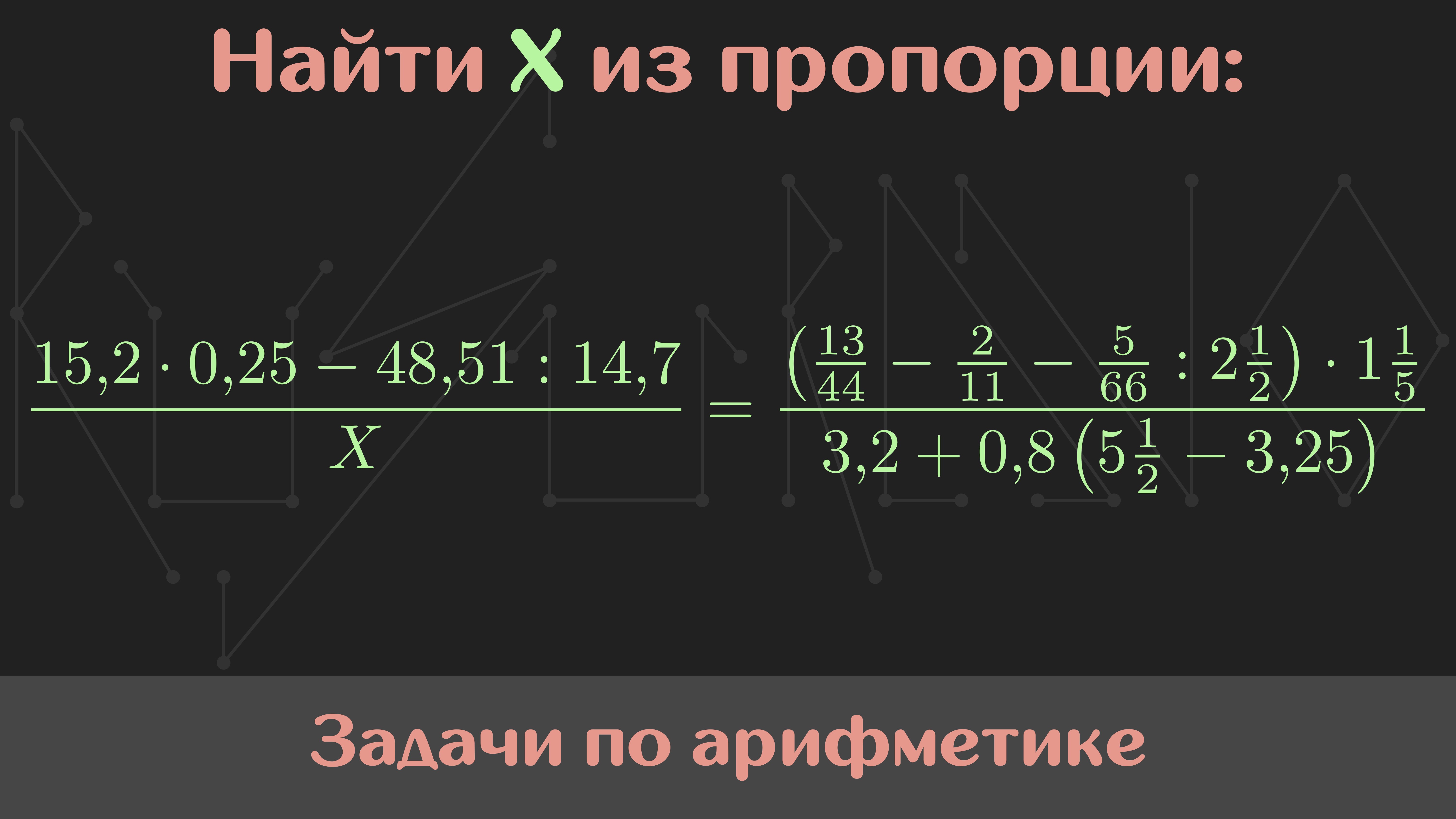Мой курс по арифметике: https://stepik.org/a/195543 Условие: Найти X из пропорции: (15.2 * 0.25 - 48.51 : 14.7) / X = (13/44 - 2/11 - 5/66 : 2[1/2]) / (3.2 + 0.8(5[1/2] - 3.25)) Памятка: перед просмотром решения задания обязательно попробуйте решить задачу самостоятельно. Так вы научитесь вырабатывать собственный подход к решению. Музыка: Nomyn — Moonlight #Сканави #Арифметика #РешайСоМной #Математика