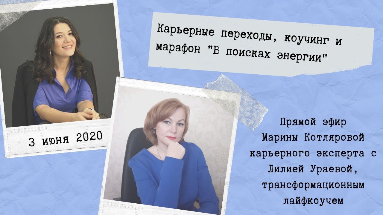 Прямой эфир Марины Котляровой, карьерного эксперта с Ураевой Лилией, трансформационным коучем Основные темы: - Как понять куда уходит внутренняя энергия? - Какие карьерные пути ведут в коучинг? - Что значит призвание и как его найти? - Как эмоции влияют на нас? - Как попасть на марафон и получить возможность восполнить жизненные силы? ⠀