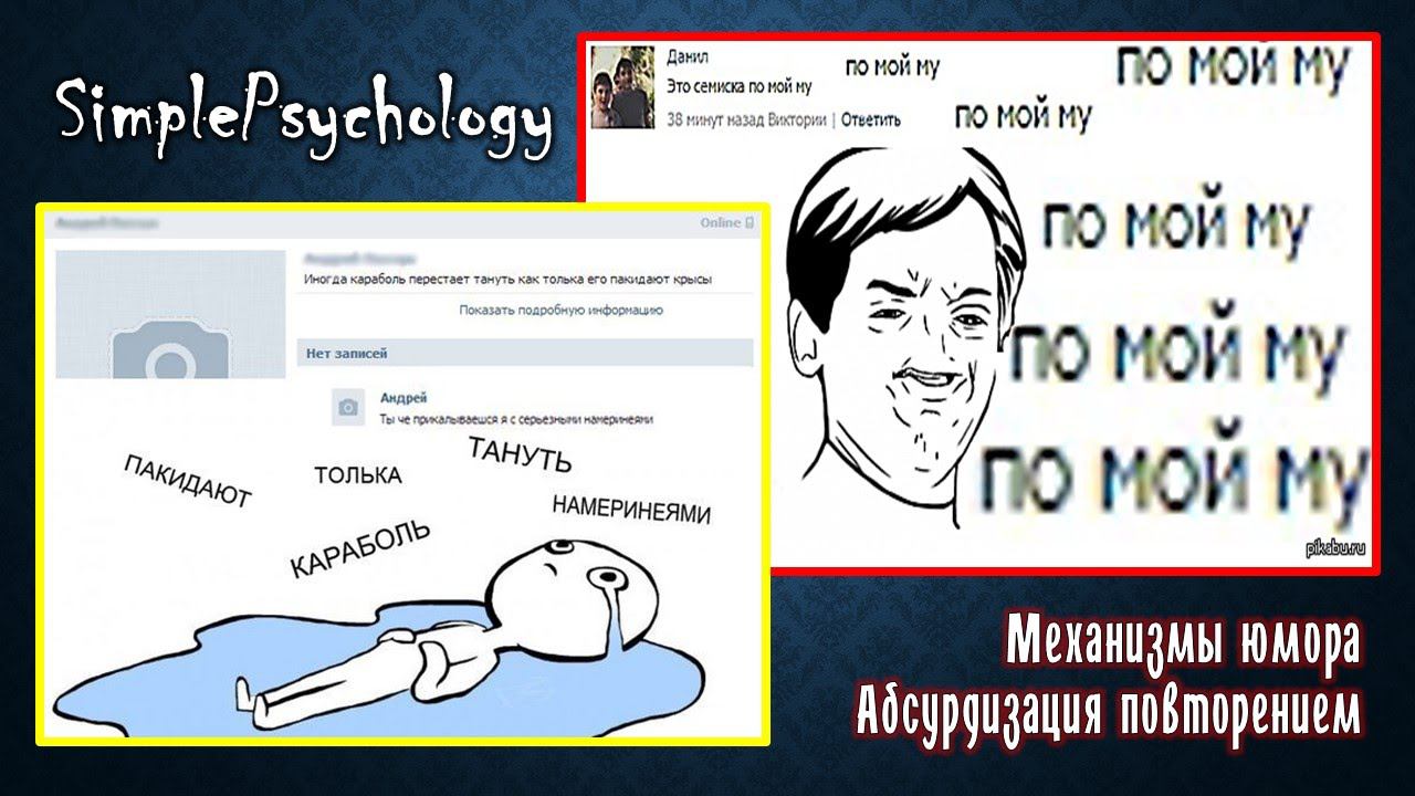 ☛ https://boosty.to/simplepsychology - новые видео и дистанционное обучение Кешбек сервис, которым я пользуюсь - http://got.by/45cbmo === - В этом видео вы научитесь строить шутку с помощью одного из приемов абсурдизации. Будет рассмотрена формальная схема построения данного вида шуток и приведены практические примеры. http://vk.com/primalinstinct - наша группа http://www.youtube.com/SimplePsychology - наш канал Для тех кто хочет поддержать проект: 41001213871702 - Яндекс кошелек R502021272863 - Вебмани Z615442054561 - Вебмани Деньги будут потрачены на покупку оборудования и организацию различных мероприятий музыка - Melodic_In_Fusion_-_Let_Go (jamendo.com) Кадры из фильмов Супергеройское кино (2008) Очень страшное кино 3 (2003) ==== Записаться на курс по гипнозу и гипноанализу - https://classicalhypnosis.ru/obuchenie