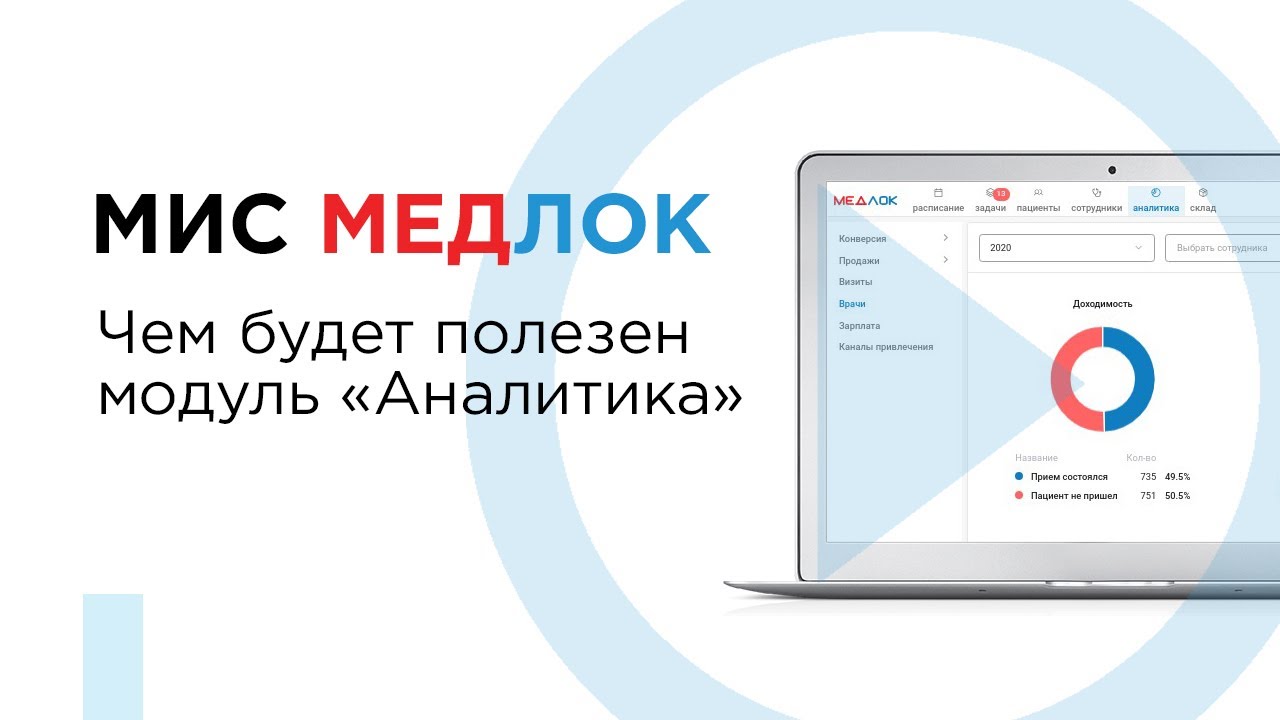 В видео рассказываем о том, чем будет полезен модуль "Аналитика" в МедЛок. Отчеты в этом разделе помогут выстроить эффективную работу сотрудников и улучшить показатели клиники. 00:00 Начало 0:20 Вкладка «Записи» 0:42 Вкладка «Продажи» 0:54 Раздел «Отчет для 1С» 1:15 Раздел «Касса» 1:28 Раздел «Продажи по специальностям» 1:45 Раздел «Продажи по врачам» 2:00 Раздел «Продажи по каналам привлечения» 2:18 Раздел «Продажи по пациентам» 2:33 Раздел «Визиты» 3:03 Раздел «Врачи» 3:17 Раздел «Зарплата» 3:28 Раздел «Каналы привлечения» 3:40 Про формат отчетов Записаться на тест-драйв и узнать подробнее — https://medlock.ru/ Сайт отзывов о врачах №1 в России * — https://prodoctorov.ru/ * по количеству отзывов, посетителей и страниц врачей (исследование "РБК", сентябрь 2019) Наши выступления — https://prodoctorov.ru/info/conf/ #продокторов #prodoctorov #медлок