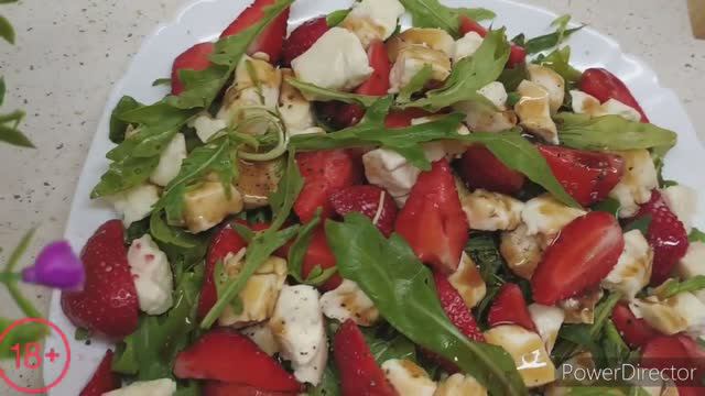 Рукола-2пучка(вес-30грамм), Банан-1шт, Сыр адыгейский 230гр, Клубника-150гр. Соль,перец по вкусу,а так же поливаем салат бальзамическим соусом.