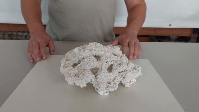 Декорация с габаритными размерами 23 х 23 х 12 см, по изделию выполнено 17 отверстий под ножку плашки ( плашками не комплектуется). Данная декорация выполнена в максимально приближенном варианте к природным СРК или ЖК, а в частности, её формой и фактурой. Поверхностные поры данного изделия все открыты, что значительно улучшает проток воды через тело самой декорации. Отлично подойдёт как центральный элемент скейпа для средних аквариумов, а так же как составной модуль для формирования скейпа в большие аквариумы.