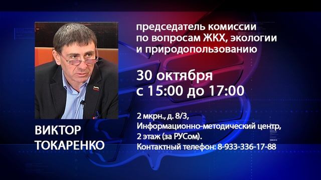 30 октября состоится прием избирателей 2-го и 3 микрорайонов и граждан всего города по личным вопросам. Прием проведет депутат Шарыповского городского Совета по избирательному округу № 5, председатель постоянной комиссии по вопросам ЖКХ, экологии и природопользованию Виктор Иванович Токаренко.