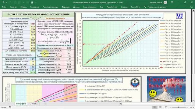 Представлено приложение к Excel - Расчета интенсивности (относительной деформации) морозного пучения грунтов. Расчет ведется по двум направлением - в зависимости от гранулометрического состава грунта по средневзвешенному диметру частиц грунта и в зависимости от физико-механических характеристик грунта по параметру расчетного сопротивления сдвигу. Скачать приложение можно по ссылке: https://disk.yandex.ru/i/GlPd-u4To92AKg Обращаю ваше внимание, что если картинка с копателями в левом нижнем углу двигается, то ваш Ексель вполне современный, в противном случае, желательно проверить настройки или перейти на более современную версию. https://www.youtube.com/watch?v=xNYFC4mFfxE