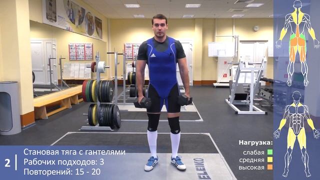 Тренировка 3 Разминка 5-10 мин https://www.youtube.com/watch?v=AqpyR6vQvj0 1. Скакалка или кардиотренажёр 7 минут 2. Становая тяга с гантелям 3х15-20 https://www.youtube.com/watch?v=ugkSLm4_XmU 3. Отжимания от лавки сзади 3 х макс https://www.youtube.com/watch?v=ba-0mdwPek0 4. Скакалка или кардиотренажёр 7 минут 5. Протяжка с гантелями 3х15-20 https://www.youtube.com/watch?v=pD9drGmxHBo 6. Скручивания лёжа на полу 3х15-20 https://www.youtube.com/watch?v=ofV3K_cHx10 7. Скакалка или кардиотренажёр 6 минут Заминка 2-5 мин https://www.youtube.com/watch?v=yM8WRIYeczA Подробнее про этот план: https://tvoytrener.com/www/tren_doma/nov_pohudenie_3.html Тренировка 1: https://www.youtube.com/watch?v=Hz4ryhO6s4o Тренировка 2: https://www.youtube.com/watch?v=KT-srVPoV28 Цель плана: похудение Задачи плана: 1. Сжигание жира 2. Укрепление мышц 3. Укрепление сердечно-сосудистой системы Методы выполнения: раздельно, комбинированно Продолжительность: около 2-х месяцев. Сложность: (ниже средней) Инвентарь: Гантели. Скакалка или кардиотренажёр. Эта программа подойдёт для полных новичков или для тех, у кого был длительный перерыв в тренировках. План не сложный. Он состоит всего из 4-х упражнений и 3-х отрезков кардио по 6-7 минут. Вместе с разминкой и заминкой тренировки рассчитаны примерно на 1 час. Тренировки фулбади. То есть вы по немногу будете тренировать все группы мышц на каждой. Каждое упражнение вы будете делать по 15-20 повторений и по 3 подхода. Где указано «макс» - нужно стараться сделать без дополнительного веса максимальное количество повторений. Подходы, кстати, указаны возле каждого упражнения. Отдых между подходами примерно 2 минуты (в зависимости от сложности подхода). Подходы указаны только рабочие. То есть, без учёта разминочных. В качестве кардио можно использовать обычную скакалку. Но если у кого-то есть домашний кардиотренажёр (эллипс, вело или дорожка), то это будет даже лучше. Если у вас совсем нет никакого кардиоинвентаря, то подойдёт обычный бег, или подъём и спуск по лестнице многоквартирного дома. Работать на кардио надо так, чтобы ваш средний пульс был примерно 110 – 140 ударов в минуту. Веса берите такие, что вы могли сделать указанное количество повторений и оставался запас на 2 – 4 повторения. Потом со временем запас надо убирать. Оптимальные дни тренировок – через день. Например: ПН, СР, ПТ. Или: ВТ, ЧТ, СБ. Как освоитесь к этой программе – можно переходить на планы потяжелее. Например, где есть суперсеты и больше упражнений. Или можете в этом плане изменить сложность, нажав на вкладку «Настройки плана». Начать можно с 15 повторений, постепенно увеличивая их до 20. Удачи!