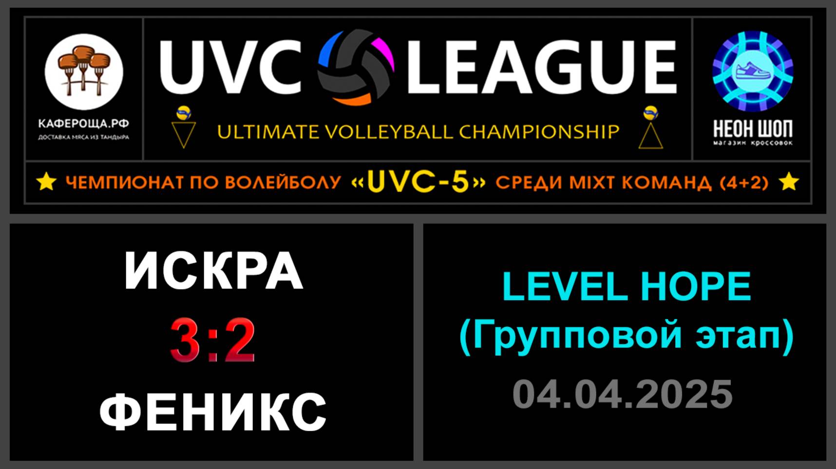 UVC-5 (Mixt): Чемпионат UVC Лиги по волейболу среди MIXT команд (4+2), 2024-2025 гг. Результаты игры: LEVEL HOPE (Групповой этап) 04.04.2025 Искра - Феникс 3:2 (18:25, 25:22, 18:25, 25:21, 18:16) Очень близкое и упорное противостояние! Это было зрелищно! 👏👏👏 #UVC_ЛИГА_ЧЕМПИОНАТ_UVC_5_Mixt