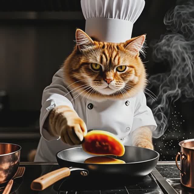 ⭐️⭐️⭐️ СЮРРЕАЛИСТИЧНЫЙ ШЕФ-ПОВАР. Идеальный блинчик от котошефа. Бон аппетит. Рыбного меню нет. Мяушки. #ПУСТАШЕВ➕ #ИИ 🟰 АРТ🩵