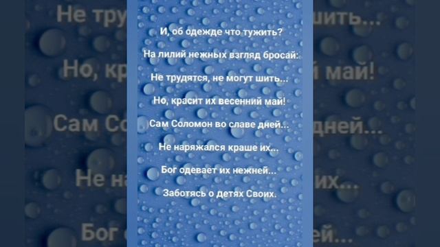 ХРИСТИАНСКИЕ ПЕСНИ ДЛЯ ХВАЛЫ ПОКЛОНЕНИЯ ПРОСЛАВЛЕНИЯ ЕВАНГЕЛИЗАЦИИ ДУХОВНОГО РОСТА ПРОБУЖДЕНИЯ ВОЗРОЖДЕНИЯ #господь#музыка#христианская_музыка#музика#христианскиепесни#бог#христианскиестихи#любовь#христианство#стихи#песня#песни#иисус#иисусхристос#иисусмойбог#иисус_христос#иисусбог#иисусгосподь#хвалы_и_поклонения#хваление#хвала#прославление#духсвятой#духовныйрост#духовноепробуждение#духовность#евангелие#евангелизация#евангельскаявесть#духовный_рост#пробуждение#рождество#рождествохристово#божий#божийнарод#божьеслово  #ХристианскаяПесня #ХристианскоеПоклонение #ХристианскаяНоваяПесня #ПастырьМоейДушы #ХристианскаяМузыка #ПесняСлавы #Иисус #ЛюбовьБожья #ХристианскиеТексты #СлаваГосподу #ВераИПоклонение #ВечнаяЛюбовь #RussianChristianSong #RussianChristianWorship #RussianChristianMusic #RussianWorship #NewRussianChristianMusic  #RussianChristianMusic #RussianSongOfPraise #Jesus #GodsLove #ChristianLyrics #GloryToGod #RussianFaithAndWorship #EternalLove #Пасха #Воскресение #ХристосВоскрес #пробуждение #возрождение https://stihi.ru/avtor/zhanna70 "ИЩИТЕ ЦАРСТВА БОЖЬИХ ВРАТ!" СЛОВА, МУЗЫКА, ОБРАБОТКА: ЖАННА ВОЛКОВА-ВАРЛАМОВА Стихи Жанна Юрьевна Волкова-Варламова https://stihi.ru/2025/05/02/704 1 Куплет Зачем душе терзаться зря...  Что будет есть, что будет пить? И, телу нашему, друзья, - Во что одежду нарядить.  Ведь, жизнь важнее, чем еда...  А, тело - платьев и рубах!  Оставьте, люди, страхи навсегда...  Не нужно сердцу быть в грехах!!!  Припев: Ищите Царства Божьих врат...  И, правды вечной...Чистый Свет...  Тогда получите стократ...  На все вопросы свой ответ!  Отец Небесный видит всё...  Он знает, что вам нужно дать...  Он Сам потребное несёт...  Вам нужно лишь Его искать!!!  2 Куплет На птиц небесных посмотри: Не сеют зёрен, и,  не жнт...  Не строят житниц изнутри...  Но, пищу каждый день найдут!  Отец Небесный кормит их...  Он знает нужды их сполна...  Не лучше ль вы созданий сих? Зачем тревог пустых волна? Припев: Ищите Царства Божьих врат...  И, правды вечной...Чистый Свет...  Тогда получите стократ...  На все вопросы свой ответ!  Отец Небесный видит всё...  Он знает, что вам нужно дать...  Он Сам потребное несёт...  Вам нужно лишь Его искать!!!  3 Куплет И, об одежде что тужить? На лилий нежных взгляд бросай: Не трудятся, не могут шить...  Но, красит их весенний май!  Сам Соломон во славе дней...  Не наряжался краше их...  Бог одевает их нежней...  Заботясь о детях Своих!!!  Припев: Ищите Царства Божьих врат...  И правды вечной...Чистый Свет....  Тогда получите стократ...  На все вопросы свой ответ!  Отец Небесный видит всё...  Он знает, что вам нужно дать...  Он Сам потребное несёт...  Вам нужно лишь Его искать!!!  Заключение: Не думай ты о дне другом...  Довольно нынешних забот!  Господь поможет нам во всём...  Он верных к радости ведёт!!!  (ооо-ооо) 01.05.2025 Жанна Волкова-Варламова __________________________________________
