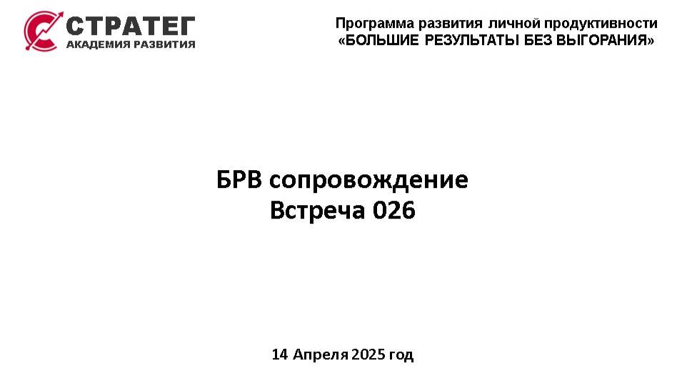 Академия развития "СТРАТЕГ" 2025.04.14 БРВ 4 Сопровождение Встреча 026 ✔️ Инсайты и достижения участников курса за неделю Опоры ВСЖ ✔️ Направляющие (базовые) опоры ВСЖ ✔️ Наполняющие (ресурсные) опоры ВСЖ ✔️ Трансформационные (реализующие) опоры ВСЖ ✔️ Интегрирующие (завершающие) опоры ВСЖ ✔️ Рефлексия и анализ ✔️ Моделирование стратегий успехов и провалов