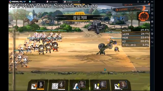 This video shows what combat in GFL is like with battle simplification turned off and on. *Made a mistake in the video, KR actually is off while EN is on.