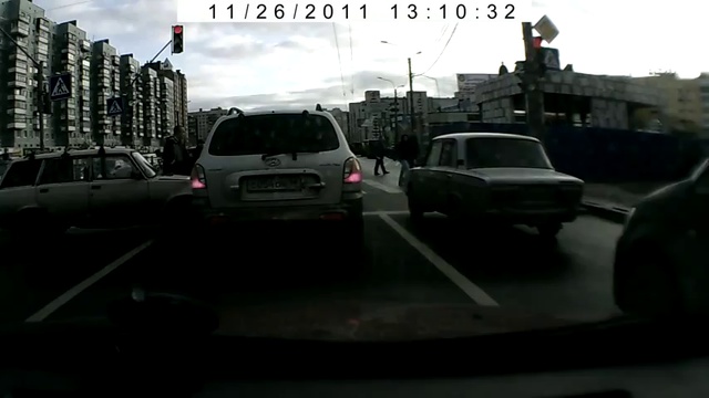 «Гонщик» за рулем ВАЗ-2104, в Петербурге (Россия), чуть не налетел на пешеходов, которые переходили дорогу на свой зеленый сигнал светофора.