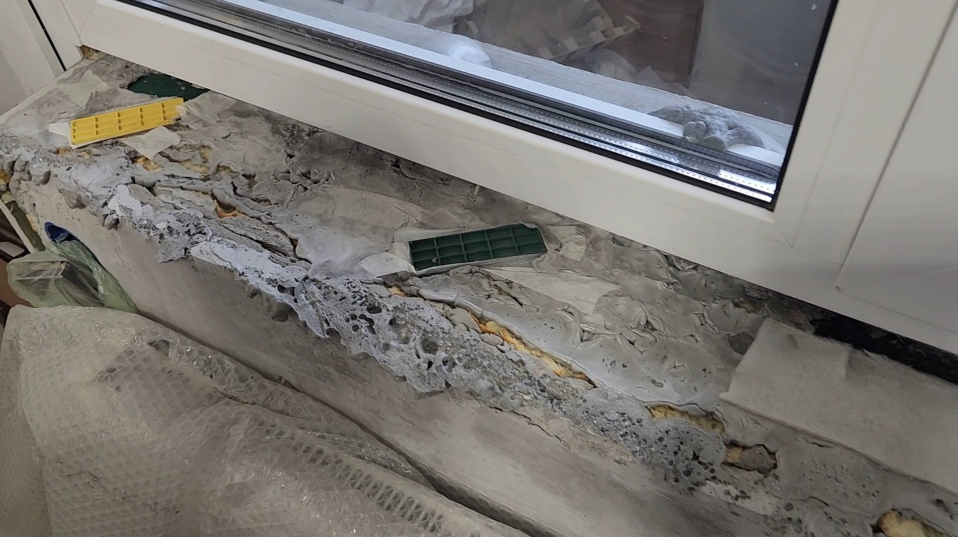 Демонтаж подоконника и состояние плоскости с клей-цементом, укрытие стен, подрезка гипсокартона, ручная грунтовка Альпа Праймер