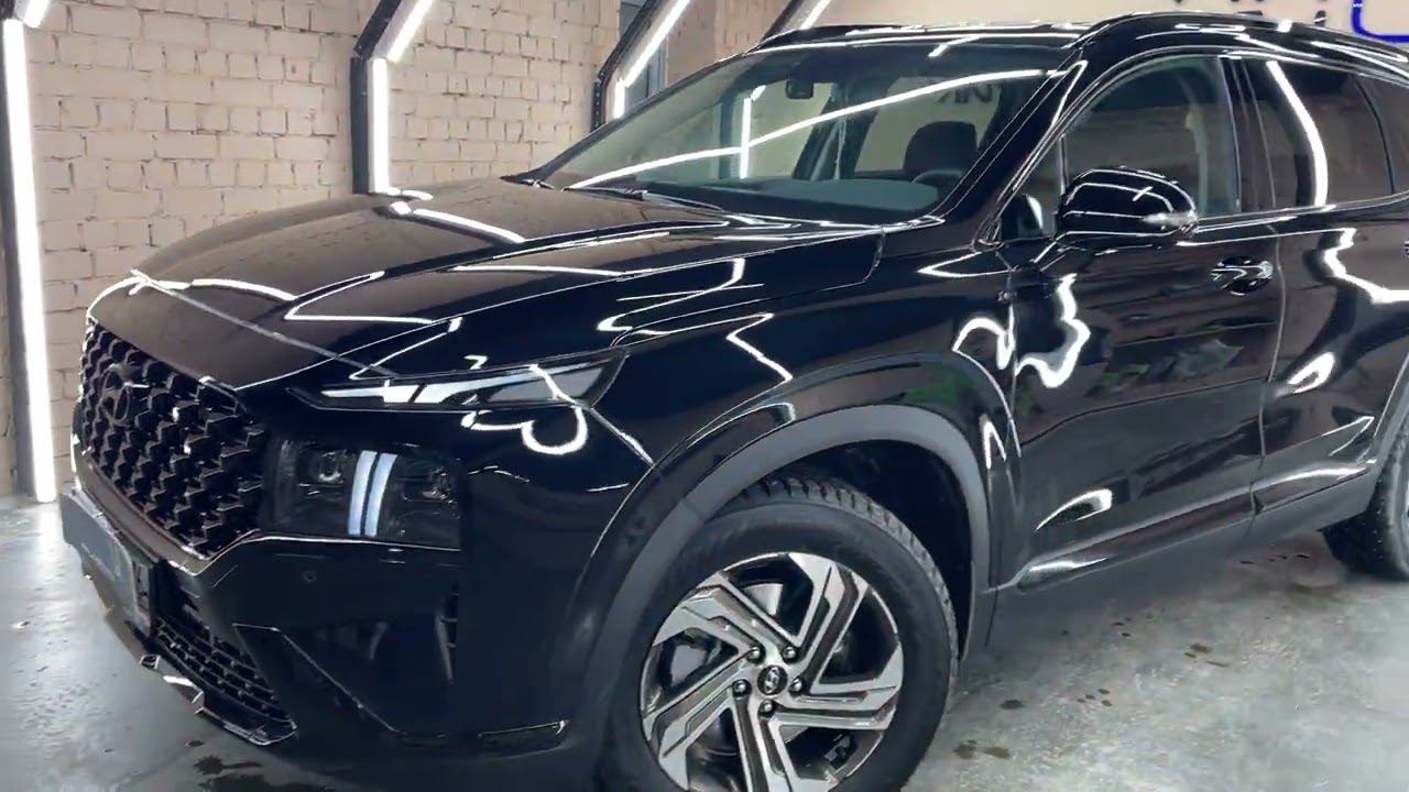Наш сайт: https://vinylkazan.ru Hyundai Santa Fe Забронировали зоны риска полиуретаном. Переднюю и заднюю оптику притемнили тонирующей плёнкой. Антихром: Покрашены решетка, значки, губа, клыки на переднем бампере, рейлинги, задний диффузор. Оклеены в черную глянцевую пленку сабля, дверные молдинги вокруг стёкол и нижние молдинги дверей.