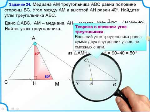 Медиана АМ треугольника АВС равна половине стороны ВС. Угол между АМ и высотой АН равен 40⁰. Найдите углы треугольника АВС.