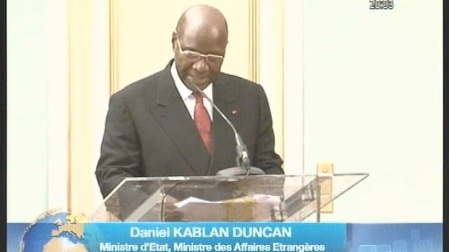 Dimanche 27 novembre 2011. Abidjan. Palais présidentiel du Plateau. En marge de la réception accordée par le chef de l`Etat, SEM Alassane Ouattara, le ministre des Affaires étrangères, Kablan Duncan et le président du Groupe de la Banque africaine de développement (BAD), Donald Kaberuka procèdent à la signature de l'accord de siège révisé pour le démarrage effectif des travaux de rénovation de l'immeuble siège de la banque en Côte d'Ivoire, une action devant donc permettre le retour de l'Institution en Côte d'Ivoire.