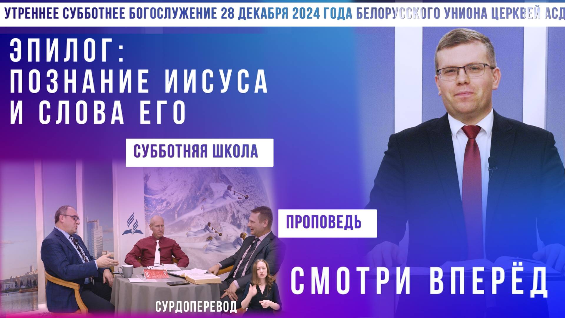 Уроки «Так говорит Библия» предоставляют уникальную возможность самостоятельно изучить учения самой читаемой книги в мире. Вы сможете узнать, что Библия говорит о прошлом, настоящем и будущем, а также найти ответы на важные вопросы, такие как: - Откуда появилось зло? - Что ждет человечество в будущем? - Почему важно молиться? - Как Библия относится к здоровью? - Живы ли мертвые? - Где находится ад? - Когда наступит Судный день? Пройдите по ссылке и заполните урок: https://biblestudy.by/lesson?GMFGUTPIADLGFU. Это займет всего около 20 минут. После выполнения задания его проверит квалифицированный преподаватель, который готов обсудить с вами все возникающие вопросы. Ссылку на следующий урок вы получите через Viber после завершения первого задания. Подписывайтесь на наш канал и нажмите на колокольчик, чтобы не пропускать новые видео. Контакты для звонков и сообщений: Viber, WhatsApp, Telegram +375 33 677 1 677. Мы будем благодарны за ваши лайки, комментарии и репосты, чтобы еще больше людей смогли узнать об этом проекте. Присоединяйтесь к разборам уроков субботней школы в 20:00: https://www.youtube.com/playlist?list=PLg_gRFjM68thKVEse4uQZTizZBLuIGVKO #народсвятой #веравБога #сГосподом #поклонение #благодать #служение #молитва #истина #духовноеразвитие #берегисебя #ввере #воимяИисуса #аминь 00:00:00 Intro 00:00:00 Пение "В Новом году вам желаем, друзья" 00:03:58 Пение "Я направил свой взор к небесам" 00:06:29 Субботняя школа, урок № 13 "Эпилог: познание Иисуса и слова Его"; сурдоперевод Елена Морозова 00:51:50 Десятины и обещания 00:53:39 Пение "Иисус к Тебе иду" 00:57:28 Пение "Не смотри" 00:59:51 Проповедь "Смотри вперёд", Вадим Деркач, пастор г. Минск, сурдоперевод Елена Морозова 01:24:21 Молитва 01:26:04 Пение "Предо мною рубеж" 01:30:14 Тихая молитва 01:30:50 Слова Благословения