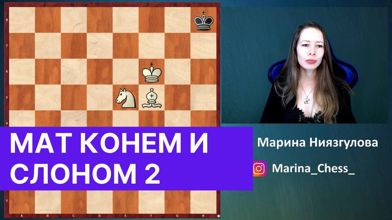 Продолжение. Мат слоном и конём — достигается не позже 33-го хода из любого начального положения только в углу цвета слона (при наилучшей защите слабейшей стороны) совместными действиями этих фигур и короля. Требует точной игры, так как необходимое для мата число ходов близко к предельно допустимому. Поддержите развитие канала на Donationalerts: https://www.donationalerts.com/r/mari... Приглашаю всех в свой клуб на Lichess: https://lichess.org/team/marina_chess... YouTube: https://www.youtube.com/c/MarinaChess Instagram: https://www.instagram.com/marina_chess_ Twitch: https://www.twitch.tv/marina_chess Chess.com: https://www.chess.com/member/marina_c... Lichess.org: https://lichess.org/@/Marina_Niyzgulova Яндекс.Эфир: https://clck.ru/S5Kgq #Marina_chess_#Шахматы