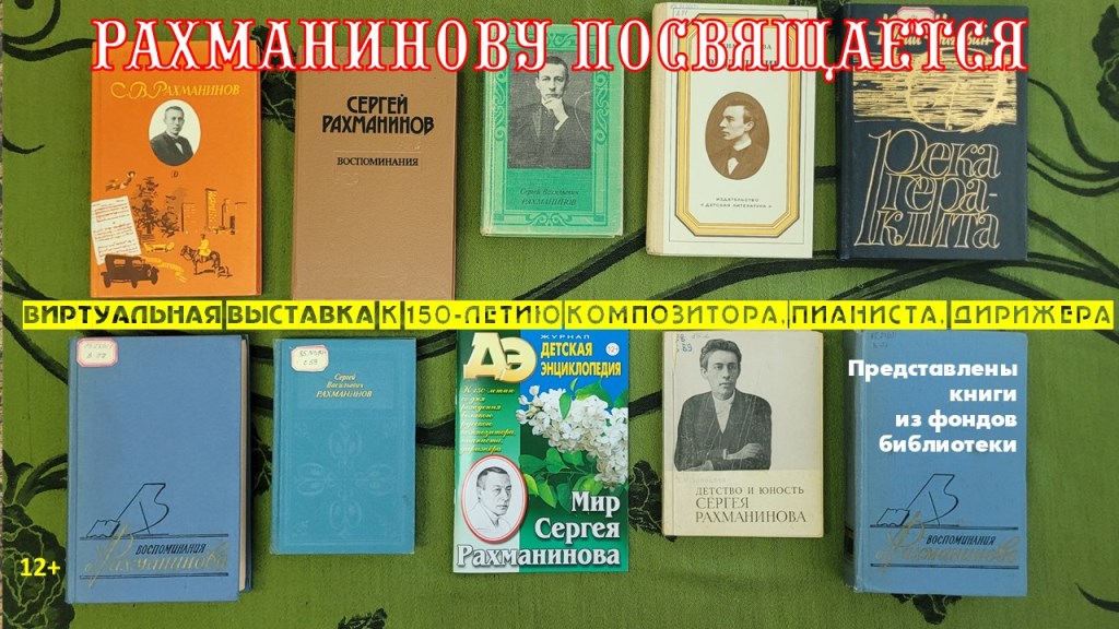 Библиотека-филиал № 12 имени А. П. Чехова предлагает к просмотру виртуальную выставку «Рахманинову посвящается», приуроченную к 150-летию композитора, пианиста, дирижера. Экспозиция составлена из изданий разных лет, хранящихся в фондах библиотеки имени А. П. Чехова. На ней представлены воспоминания самого Сергея Васильевича, его родных, друзей, современников – о музыканте.