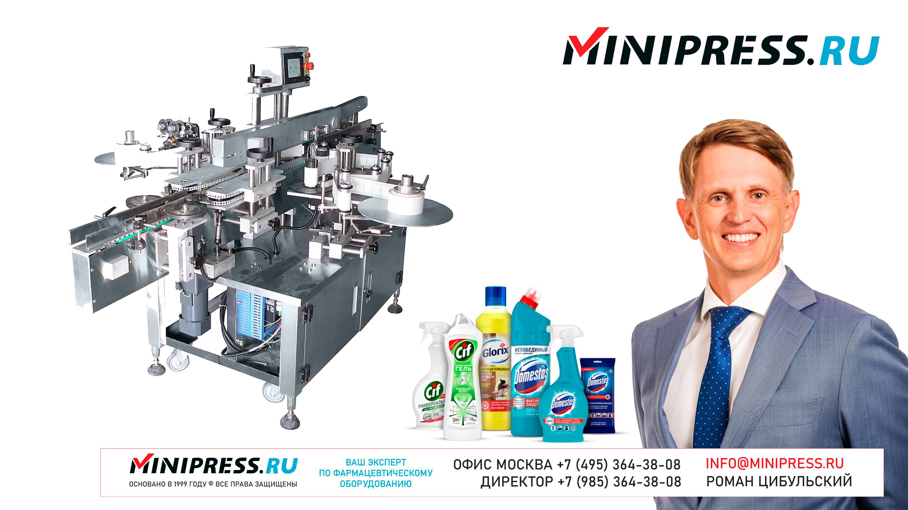 Автоматическая двусторонняя этикетировочная машина ST-36 https://Minipress.ru/katalog/ Фармацевтическое оборудование. Специалисты в фармацевтическом оборудовании и технологиях производства лекарств. Более 20 лет оказываем нашим клиентам помощь в выборе, поставке, наладке различного фармацевтического оборудования! Вы в поиске надежного поставщика оборудования? Мы предоставим вам лучший сервис 24/7. Собрана лучшая команда профессионалов в фармацевтической отрасли и налажены стабильные связи с лучшими производителями. Мы не только продаем, но и производим многие модели оборудования Директор компании Минипресс Роман Цибульский Поставка фармацевтического оборудования в Россию Пишите: info@minipress.ru Телефон +7(495)364-38-08; Мобильный +375(29)308-00-00 Россия, Москва Skype: RomanTsibulsky; ICQ: 310-134-490 Подписывайтесь на наш видео канал на Youtube https://youtube.com/user/wwwMinipressru Обновленный сайт https://Minipress.ru Каталог оборудования https://Minipress.ru/katalog/ МЫ В СОЦИАЛЬНЫХ СЕТЯХ G+ https://plus.google.com/+RomanTsibulsky/ FB https://facebook.com/roman.tsibulsky YOUTUBE https://youtube.com/user/wwwMinipressru IN https://ru.linkedin.com/pub/roman-tsibulsky/a6/933/661 БОЛЬШОЙ КАТАЛОГ ФАРМАЦЕВТИЧЕСКОГО ОБОРУДОВАНИЯ https://minipress.ru/katalog/ Постоянно обновляемый каталог различного фармацевтического оборудования с фотографиями, описаниями, видео и ценами. ПЕРСОНАЛЬНЫЙ МЕНЕДЖЕР 24 ЧАСА https://minipress.ru/katalog/ Вы общаетесь по всем вопросам, с момента первой консультации и до получения оборудования, с одним специалистом. СПЕЦИАЛИСТЫ И ТЕХНОЛОГИ https://minipress.ru/katalog/ Имеем обширные связи в фармацевтической среде, найдем любого специалиста, поможем с освоением оборудования и технологий. ОБСУЖДЕНИЕ ВАШИХ ИДЕЙ ПО ПРОИЗВОДСТВУ ПРОДУКЦИИ https://minipress.ru/katalog/ Поможем в оценке ваших идей. Большой опыт в организации различных производств и выпуске продукции. Ценные советы. ФАРМАЦЕВТИЧЕСКОЕ ОБОРУДОВАНИЕ Мы поставили перед собой задачу, помогать нашим клиентам в правильном выборе фармацевтического оборудования. Многолетний опыт подобной деятельности показывает, что многие клиенты сталкиваются, в первую очередь, с непониманием технологического процесса. Покупка оборудования должна быть финальной точкой после подробного обсуждения задачи, консультацией с производителем оборудования, отправкой сырья и материалов на фабрику, тестирования в работе. ДЛЯ ТАБЛЕТОК https://minipress.ru/katalog/category/farmacevticheskoe_oborudovanie/ Смешивание порошков, гранулирование, прессование, обеспыливание, покрытие оболочками, фасовка, упаковка, счет, нанесение логотипов ДЛЯ ЖЕЛАТИНОВЫХ КАПСУЛ https://minipress.ru/katalog/category/farmacevticheskoe_oborudovanie/kapsulyatory-dlya-tverdyh-zhelatinovyh-kapsul/ Фасовка порошков и масел, обеспыливание, счет и фасовка, упаковка, нанесение логотипов. ФАСОВКА И УПАКОВКА https://minipress.ru/katalog/category/upakovochnoe_oborudovanie/ Упаковка в пластиковые и стеклянные флаконы, блистер, фольгу, ламинированную бумагу, стеклянные ампулы, саше, стрипы, тубы, тюбики, контурную ячейку. ТЕХНОЛОГИЧЕСКОЕ https://minipress.ru/katalog/category/eksperimentalnoe-oborudovanie/ Лабораторное, аналитическое, подготовительное, отдельные машины и линии под ключ. СФЕРЫ ДЕЯТЕЛЬНОСТИ Наша компания занимается множеством направлений фармацевтического бизнеса! Предлагаем Вам посетить страницы нашего сайта https://www.Minipress.ru по различным специализациям. ОБОРУДОВАНИЕ ДЛЯ НАКЛЕЙКИ ЭТИКЕТОК НА БУТЫЛКИ АМПУЛЫ ФЛАКОНЫ https://minipress.ru/katalog/oborudovanie-s-otzyvami/oborudovanie-dlya-naklejki-etiketok-na-butylki-ampuly-flakony/ Автоматическое этикетировочное оборудование для этикеток на клеевой 