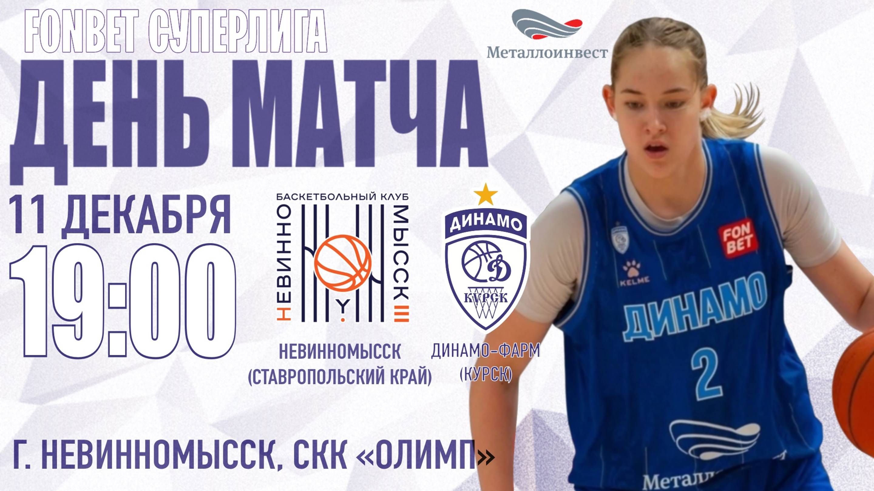11.12.2024 19:00 Невинномысск (Ставрополь) - Динамо-Фарм (Курск) ФОНБЕТ ЧЕМПИОНАТ РОССИИ - СУПЕРЛИГА. Регулярный чемпионат Время матча: 19:00 Арена: Невинномысск, СКК "Олимп" Статистика: https://competitions.russiabasket.ru/superliga/women/game/?id=837448
