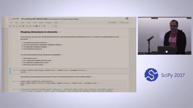 There are audio issues with this video that cannot be fixed. We recommend listening to the tutorial without headphones to minimize the buzzing sound. Tutorial information may be found at https://scipy2017.scipy.org/ehome/220975/493423/ Visualization represents a major bottleneck in scientific research, engineering, data science, and data analytics. The tools in the Python scientific ecosystem make it very simple to do many of the tasks required, but building visualizations to help understand complex patterns and relationships in your data still typically involves a large amount of custom coding for every new type of plot. Writing long and detailed scripts for plotting slows down the process of exploration and reporting, while the difficulty involved means that many important observations and discoveries are missed due to inadequate visualizations. The complexity of the resulting plotting code makes it difficult to rapidly build sophisticated, interactive visualizations that can quickly reveal the underlying structure of the data, and once such complex plotting scripts have been created they can be a major impediment to future understanding, reproduction, and modification of the research process. In this tutorial, you will learn how to approach the problem of interactive visualization declaratively. Using the HoloViews library, you can annotate your data and store it in general-purpose containers that will be instantly visualizable. The declarative objects in HoloViews wrap your data to make it incredibly easy to visualize how different sets of data relate to each other, using subfigures, animations, interactive widgets and custom interactions. This flexibility has made HoloViews the chosen future replacement for the high-level Bokeh Charts API and works particularly well with IPython/Jupyter notebooks, where you can immediately see the output from selecting, combining, slicing, or sampling these objects. Each of these operations generates a different type of visualization, that can be flexibly extended even to complex dashboards deployed using the Bokeh server or Jupyter dashboards. The core design principle of HoloViews is to make it simple to create complex plot layouts and interactivity by applying compositional operations to a small number of elements and containers. Since HoloViews separates the declaration of the data from the precise visual details of the plotting code, the same HoloViews objects can be rendered using matplotlib for publication-quality plots, or bokeh for interactive use. Overall, this means the user can focus on **what** to plot before worrying about **how** exactly it should be displayed, providing a huge boost in productivity.