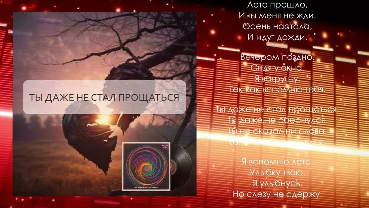 "Ты даже не стал прощаться" - музыкальный трек с альбома "Нажми на стоп-кран" AnaSM, 2024 ТЫ ДАЖЕ НЕ СТАЛ ПРОЩАТЬСЯ Лето прошло, И ты меня не жди. Осень настала, И идут дожди. Вечером поздно, Сидя у окна. Я загрущу, Так как вспомню тебя. Ты даже не стал прощаться. Ты даже не обернулся. Ты не сказал ни слова. Взглянул и отвернулся. ... #музыка #музыкадлядуши #песнисосмыслом #песня #альбом #новинки2024 #песни #песнисосмыслом #музыка #пролюбовь #музыкальный трек #AnaSM #music #пишупесни