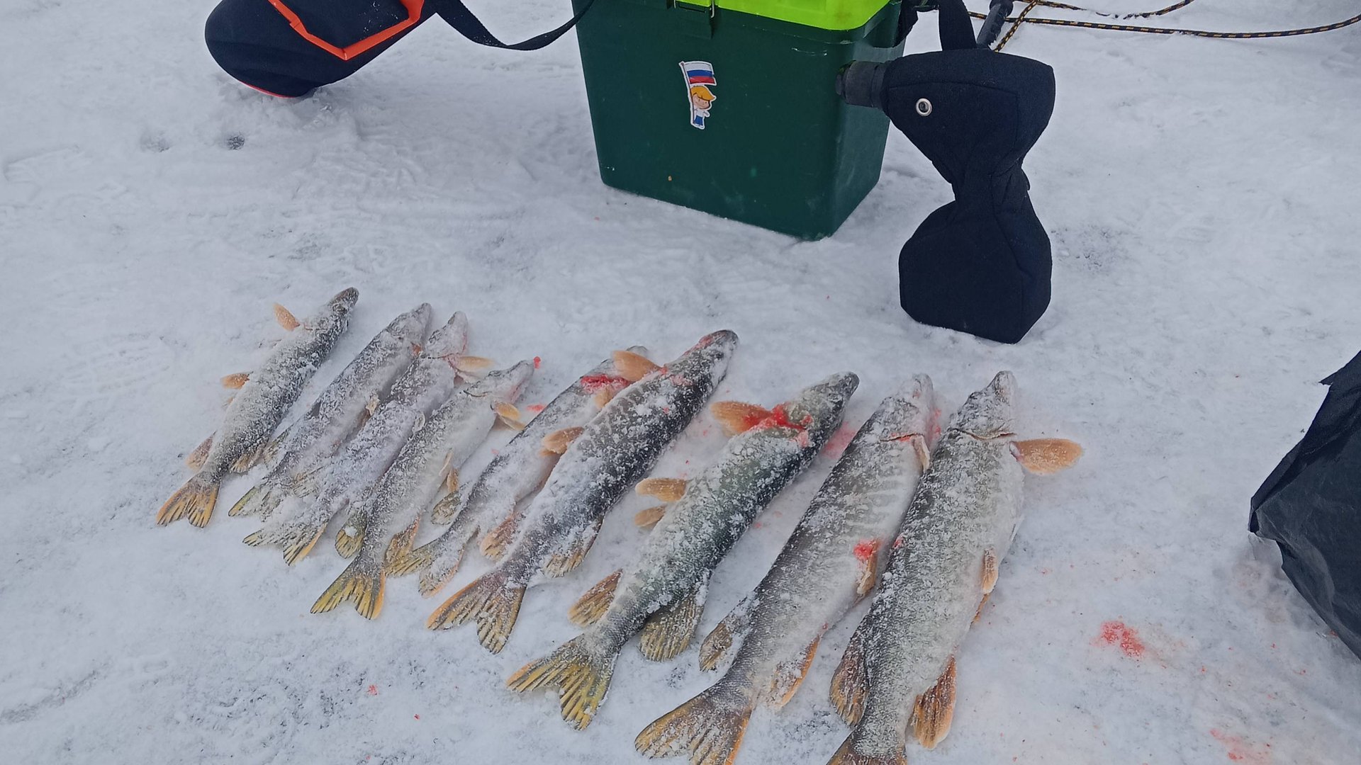 Адреналин зашкаливает, щука атакует наши жерлицы без поводка.