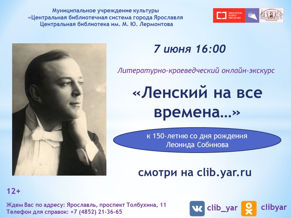 7 июня в 16:00 Центральная библиотека имени М. Ю. Лермонтова представляет литературно-краеведческий онлайн-экскурс «Ленский на все времена…», посвященный 150-летию со дня рождения великого певца Леонида Собинова. Русский оперный певец Леонид Витальевич Собинов родился 7 июня (26 мая по старому стилю) 1872 года в Ярославле в семье купца. В 1881 году поступил в мужскую гимназию имени Александра I Благословенного, которую окончил с серебряной медалью. Петь Собинов начал еще в детстве в хоре при церкви Демидовского юридического лицея (позднее Ярославский государственный университет, в 1924 году расформирован).
