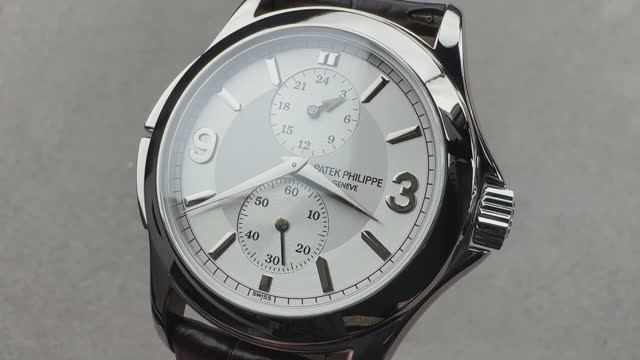 *перевести видео можно в Яндекс браузере Заводные часы Patek Philippe Calatrava Travel Time (5134G-011) с ручным управлением, в корпусе из белого золота 18 карат диаметром 37 мм, обрамляющем серебряный циферблат, на коричневом ремешке из кожи аллигатора с застежкой Calatrava Cross из белого золота 18 карат. Функции включают в себя часы, минуты, секунды и время gmt/мировое время. Толщина этих часов Patek Philippe также составляет 10,7 мм, а расстояние от выступа до выступа составляет 46 мм. Для получения более подробной информации ознакомьтесь с полным обзором времени в пути Patek Philippe Calatrava.
