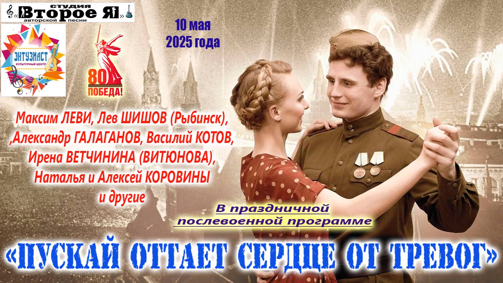 Участники: Максим Леви, Лев Шишов, Александр Галаганов, Валентина Крылова, Ирена Ветчинина (Витюнова), Алексей и Наталья Коровины, Василий Котов, Татьяна Колесса, Ольга Канунова, Вероника Захарова, Наиль Шайдуллин, Наталья Преображенская. Продолжительность – 3 часа 22 минуты. Культурный центр ТСЖ «Энтузиаст»: Москва, Шоссе Энтузиастов, дом 10/2, метро «Площадь Ильича», «Римская». 10 мая 2025 года.