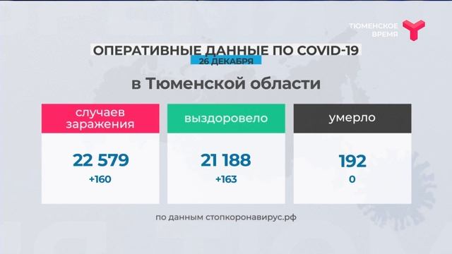 За сутки в Тюменской области 160 новых случаев коронавируса. За весь период пандемии в регионе заболели 22 579 человек, выздоровели - 21 188. В России за сутки положительный тест на COVID-19 получили 29 258 человек. Выздоровели 28 185 пациентов, зафиксировано 567 летальных исходов. Такие данные передаёт сайт стопкоронавирус.рф