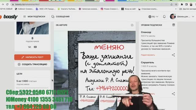 Содержание урока смотри в описании трансляции Сайт www.romansnezhko1.com ☎️Телефон +7 964 720 00 00 Избавиться от заикания легко вместе с Романом Снежко 00:00:07 Введение и приветствие • Приветствие зрителей и спонсоров. • Представление сайта и аккаунта школы для заикающихся. • Обещание рассказать о способах исправления заикания. 00:01:06 Важность дисциплины и ответственности • Зависимость успеха от ученика. • Проблемы с дисциплиной и посещаемостью занятий. • Программа речевой балансировки. 00:03:15 Речевые режимы • Описание различных речевых режимов: диалог, комментатор, чтение, пересказ. • Проблемы заикающихся на публике. • Необходимость тренировки в разных речевых режимах. 00:04:55 Проблемы заикающихся на публике • Заикающиеся часто говорят дома лучше, чем на публике. • Непривычные речевые режимы на публике. • Необходимость сбалансированного режима диалога и спора. 00:08:39 Речевые мастера и заикающиеся • Заикающиеся окружены людьми с хорошей речью. • Заикание как речевая хромота. • Замкнутость и страх перед речью у заикающихся. 00:13:32 Программа речевой балансировки • Уникальность программы речевой балансировки. • Создание речевых эталонов для заикающихся. • Важность балансировки мышц, дыхания, внимания и памяти. 00:15:34 Проблемы дисбаланса • Заикающиеся часто не могут найти баланс в речи. • Проблемы с медленной и быстрой речью. • Влияние стресса и увеличения речевой нагрузки на заикание. 00:18:21 Заключение • Сравнение речевого аппарата с музыкальным инструментом. • Необходимость гармоничного взаимодействия с речевым аппаратом. • Важность правильного подхода к лечению заикания. 00:19:00 Важность речевого музицирования • Речевые мелодии должны быть гармоничными и плавными. • Необходимо диагностировать дисбалансы у заикающихся. • Дисбалансы могут быть психическими, мускульными, эмоциональными или связанными с техникой произношения. 00:20:02 Порядок балансировки • Важно сбалансировать эмоции до работы с речевым аппаратом. • Перенапряжение мускулов приводит к заиканию. • Звук не выдавливается силой, нужно понимать возможности инструмента. 00:22:13 Вопросы и ответы • Важно задавать вопросы, даже если они некорректны. • Вопросы помогают подготовиться к личным занятиям. • На личных занятиях каждая минута будет оплачиваться. 00:25:01 Балансировка речи • Невозможно сбалансировать речь без эталонов. • Балансировка требует навыков и практики. • Балансиры могут быть материальными или умозрительными. 00:28:54 Дисциплина и ответственность • Дисциплинированные ученики быстрее достигают успеха. • Недисциплинированные ученики не могут быть обучены качественно. • Ответственность ученика важна для достижения результатов. 00:35:42 Проблемы с чатом • Чат отключен, что мешает общению с аудиторией. • Автор предлагает писать вопросы по телефону или в WhatsApp. • Вопросы можно задавать в любое время, не только во время трансляции. 00:40:12 Продолжение обучения • Обучение нужно продолжать до достижения самостоятельного баланса. • Если баланс не достигнут, значит, что-то делается неправильно. 00:41:00 Психо нестабильные люди • Психо нестабильные люди разбалансированы и не могут контролировать себя. • Большинство заикающихся не являются психически нестабильными. • Психо нестабильность может проявляться в агрессии или эпилептических приступах. 00:43:29 Влияние стресса на речь