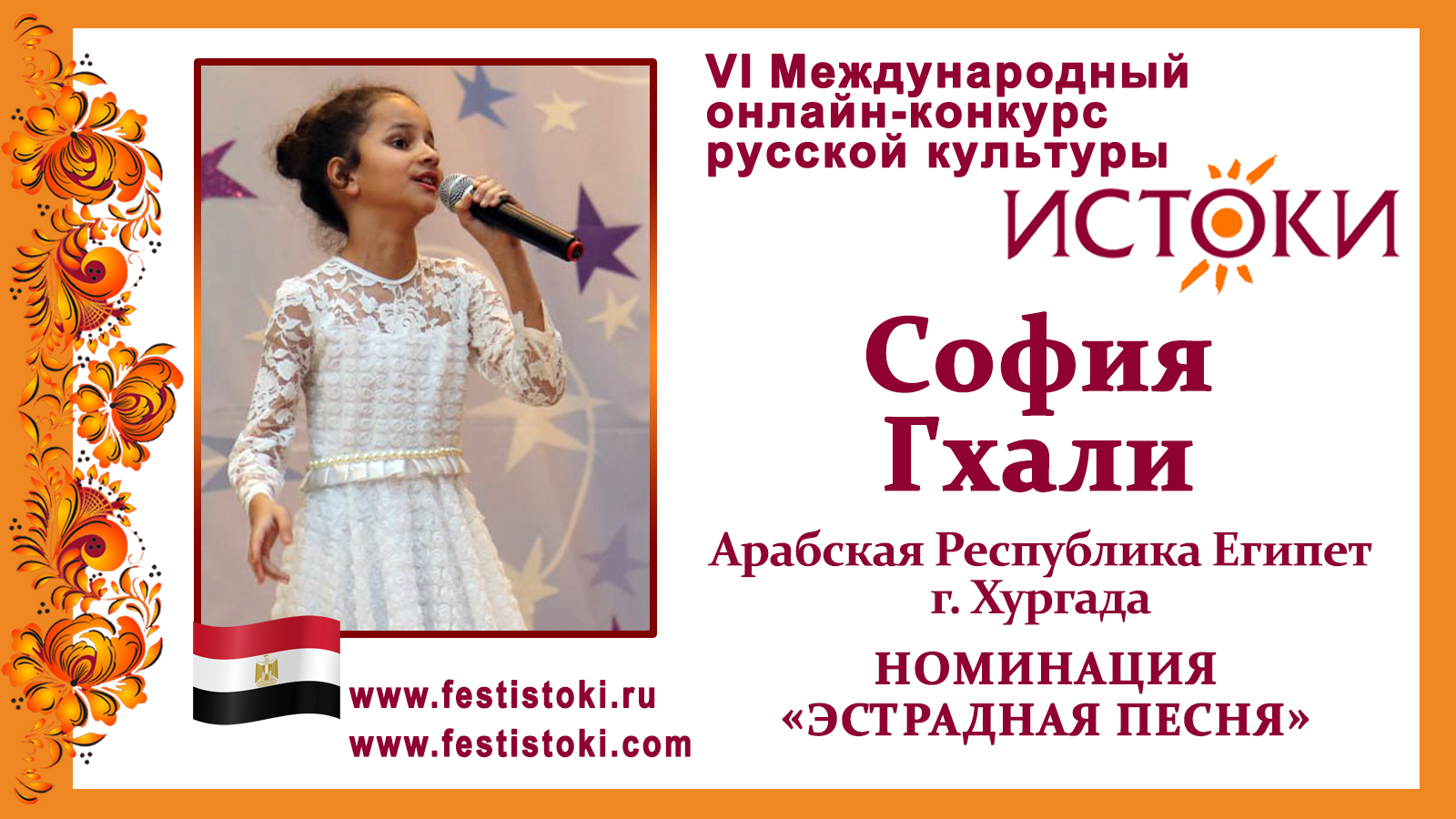 Участник VI Международного онлайн-конкурса русской культуры "Истоки". Номинация "Эстрадная песня". Песня "Прекрасное далёко". Композитор Евгений Крылатов, стихи поэта Юрия Энтина. Сайт: www.festistoki.ru / www.festistoki.com E-mail: festistoki@mail.ru