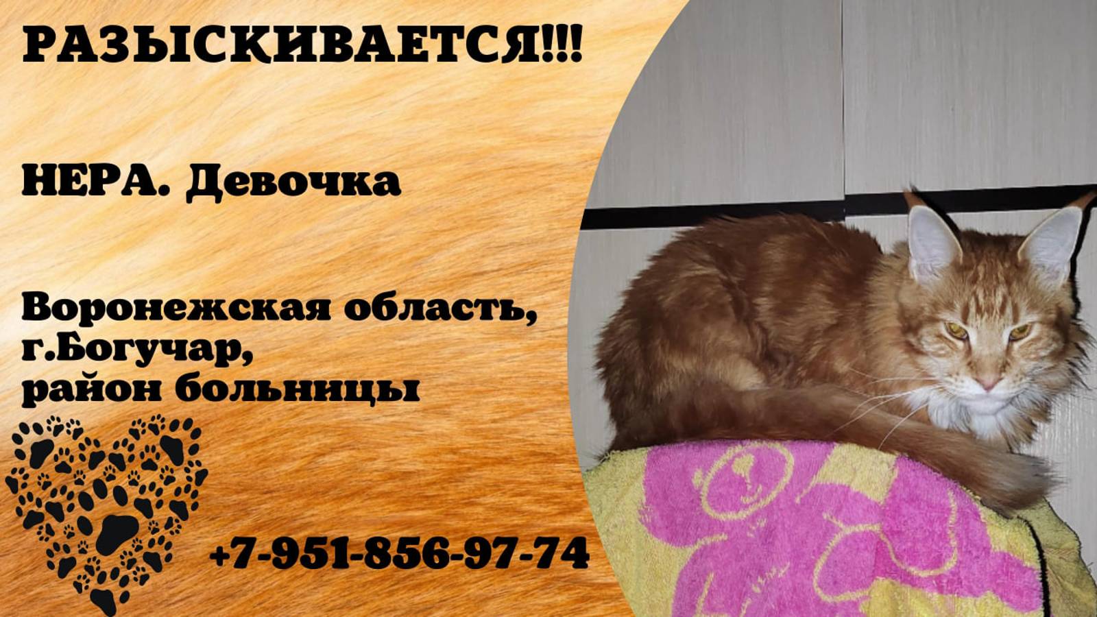 Воронежская Богучар Пропала кошка Потерялась кошка Нера в районе больницы, очень пугливая, никогда не была на улице. На имя скорее всего не будет отзываться. Может прятаться в кустах или в любом укровном месте, если видели её, пожалуйста, напишите или позвоните 89518569774 Инфо https://vk.com/wall-198815410_154325 Автор https://vk.com/id270322734
