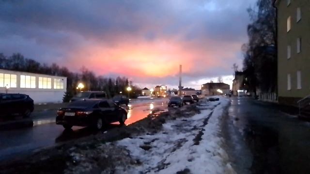 Над площадью Победы открылось красивое небесное зарево. Везде было тёмное небо, а над площадью облака разошлись в стороны и солнце заглянуло на землю.A beautiful heavenly glow opened above Victory Square. There was a dark sky everywhere, and over the square the clouds parted and the sun peered into the earth.