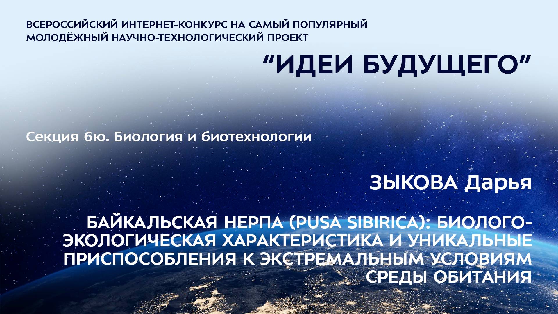 (6Ю-12) ЗЫКОВА Дарья Андреевна Иркутская область, г. Иркутск ЧОУ «Точка будущего», 3 класс БАЙКАЛЬСКАЯ НЕРПА (PUSA SIBIRICA): БИОЛОГО-ЭКОЛОГИЧЕСКАЯ ХАРАКТЕРИСТИКА И УНИКАЛЬНЫЕ ПРИСПОСОБЛЕНИЯ К ЭКСТРЕМАЛЬНЫМ УСЛОВИЯМ СРЕДЫ ОБИТАНИЯ Научные руководители: Зыкова Ольга Павловна, Иркутская область, г. Иркутск, ЧОУ «Точка будущего», руководитель младшей школы, учитель информатики, Русановская Ольга Олеговна, Иркутская область, г. Иркутск, ЧОУ «Точка будущего», кандидат биологических наук, учитель биологии Более подробно о мероприятиях Программы "Шаг в будущее" можно узнать на сайтах http://www.step-into-the-future.ru/ и http://шагвбудущее.рф
