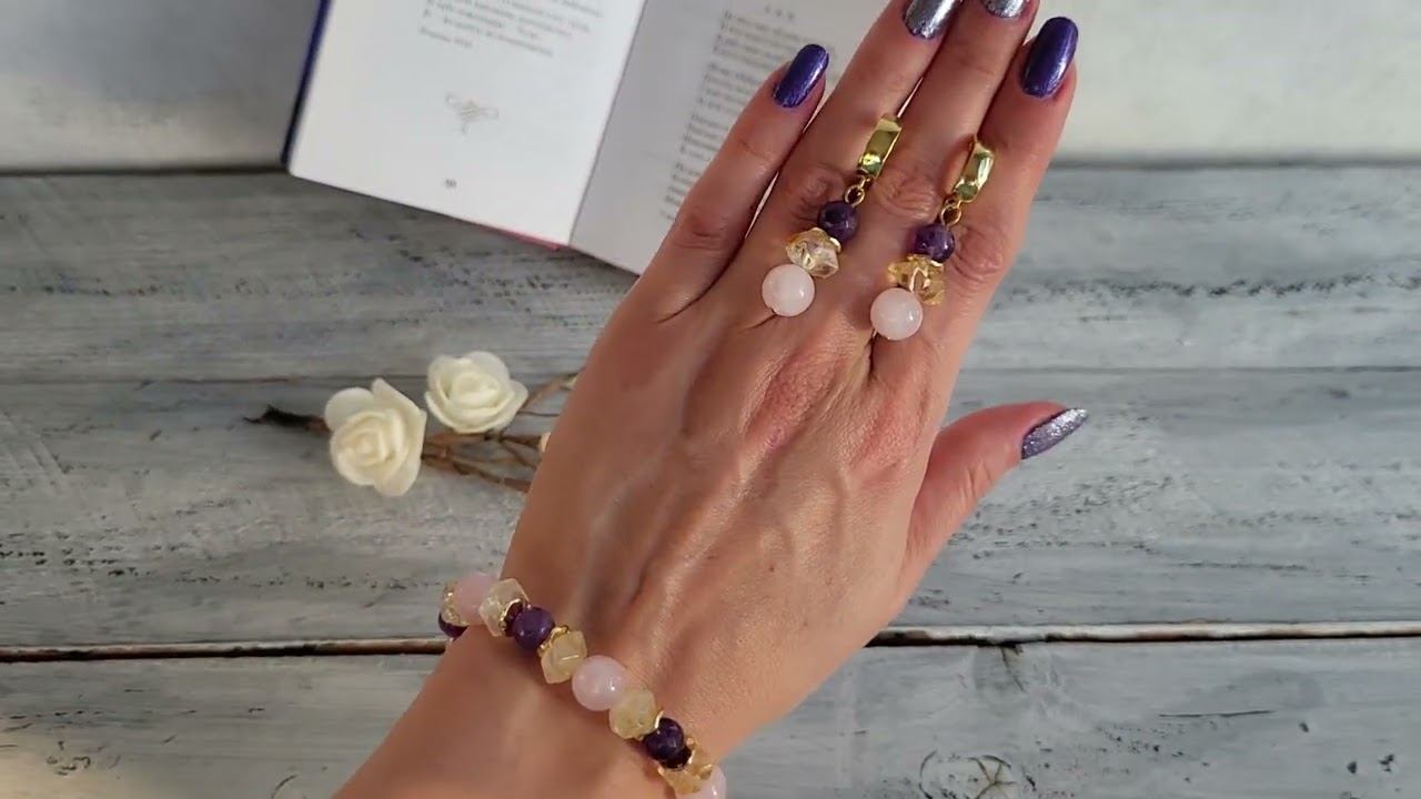Комплект из розового кварца, цитрина, аметиста