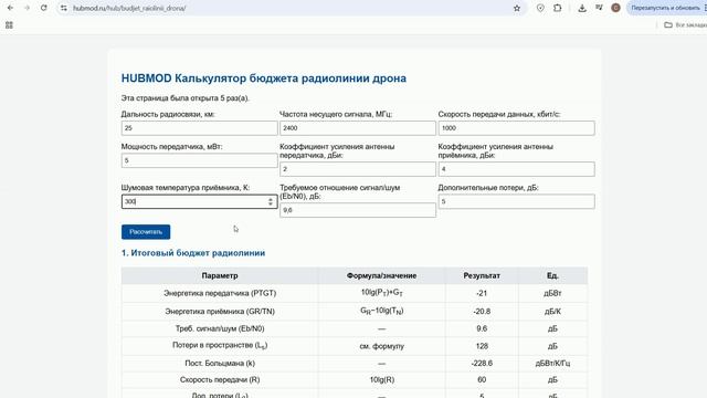 HUBMOD.RU Бесплатные Демо-Уроки — посмотрите и убедитесь: Всё просто и понятно! --- Добро пожаловать на страницу калькулятора радиолинии. --- Этот инструмент поможет рассчитать параметры радиосвязи. --- Шаг первый. --- Введите мощность передатчика. --- Это поле называется «Энергетика передатчика». --- Шаг второй. --- Введите коэффициент усиления антенны передатчика. --- Это значение используется в формуле «Энергетика передатчика». --- Шаг третий. --- Введите коэффициент усиления антенны приёмника. --- Это поле называется «Энергетика приёмника». --- Шаг четвёртый. --- Введите шумовую температуру приёмника. --- Это значение также используется для расчёта «Энергетики приёмника». --- Шаг пятый. --- Укажите требуемое отношение сигнал-шум. --- Это поле называется «Требуемый сигнал-шум». --- Шаг шестой. --- Введите скорость передачи данных. --- Это поле называется «Скорость передачи». --- Шаг седьмой. --- Укажите дополнительные потери, если они есть. --- Это поле называется «Дополнительные потери». --- После заполнения всех полей нажмите кнопку для расчёта. --- Калькулятор покажет результаты в таблице. --- В таблице вы увидите: --- Энергетику передатчика в децибел-ваттах. --- Энергетику приёмника в децибелах на кельвин. --- Требуемое отношение сигнал-шум в децибелах. --- Потери в пространстве в децибелах. --- Постоянную Больцмана в децибел-ваттах на кельвин-герц. --- Скорость передачи в децибелах. --- Дополнительные потери в децибелах. --- Итоговый бюджет радиолинии в децибелах. --- А также дальность связи для разных частот. --- Для каждого параметра указаны единицы измерения и значение результата. --- На странице также отображается счётчик посещений — сколько раз калькулятор был открыт. --- Если остались вопросы — обратитесь к инструкции на сайте. --- ---