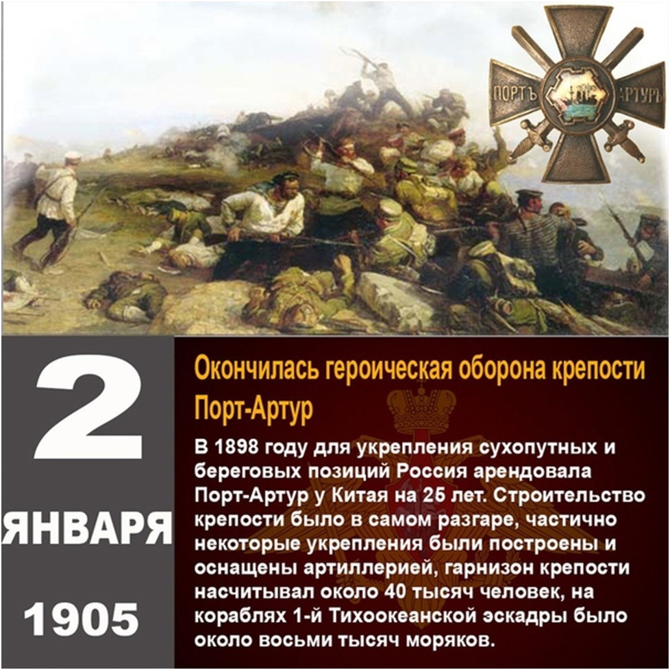 2 января 1905 г. Окончилась героическая оборона крепости Порт-Артур Для укрепления сухопутных и береговых позиций Россия арендовала Порт-Артур у Китая на 25 лет, начиная с 1898 года. Строительство крепости было в самом разгаре, частично некоторые укрепления были построены и оснащены артиллерией, гарнизон крепости насчитывал около 40 тысяч человек, на кораблях 1-й Тихоокеанской эскадры было около восьми тысяч моряков. (27 января) 9 февраля 1904 года началась Русско-японская война. Оборона Порт-Артура велась под руководством генерал-лейтенанта А.М. Стесселя, сухопутной обороной руководил генерал-лейтенант Р.И. Кондратенко, комендантом крепости был генерал-лейтенант К.Н. Смирнов. Благодаря героической обороне был скован весь флот противника и армия численностью около 200 тысяч человек. Осада Порт-Артура стала самым продолжительным сражением Русско-японской войны. Во время осады широко применялись такие новые виды оружия как 11-дюймовые мортиры, скорострельные гаубицы, пулемёты Максим, заграждения из колючей проволоки, ручные гранаты. Порт-Артур стал местом рождения нового оружия — миномета. Идею миномета разработал и осуществил на деле мичман Власьев. Порт-Артур стоил противнику колоссальных жертв. Сильно поредевший гарнизон крепости, оставшийся почти без боеприпасов и продовольствия, изрядно потрепал силы противника – японцы потеряли более 110 тысяч человек и 15 боевых кораблей. (16) 29 декабря 1904 года генерал-лейтенант А.М. Стессель принял решение о сдаче Порт-Артура, и (20 декабря 1904) 2 января 1905 года начались переговоры о сдаче российской военно-морской крепости Порт-Артур. Акт капитуляции был подписан через три дня. Русский флот потерял почти всю Первую Тихоокеанскую эскадру. Стратегическое значение обороны Порт-Артура было огромным. Гарнизон крепости сковывал армию в 200 тысяч человек и почти весь флот противника. Но падение крепости позволило японцам освободить 3-ю армию, уничтожить русский флот, захватить 610 орудий, взять в плен 32 тысячи человек, включая больных и раненых. А через несколько недель после падения Порт-Артура в России началась революция.