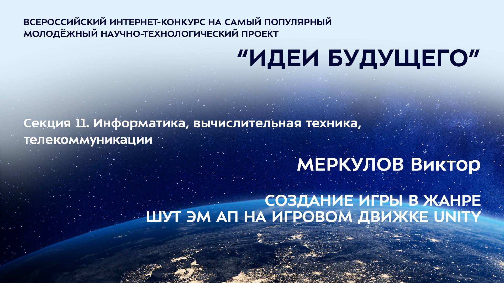 (11-15) МЕРКУЛОВ Виктор Андреевич Мурманская область, г. Ковдор МБОУ СОШ № 1, 9 класс СОЗДАНИЕ ИГРЫ В ЖАНРЕ ШУТ ЭМ АП НА ИГРОВОМ ДВИЖКЕ UNITY Научный руководитель: Кудрявцева Ирина Михайловна, Мурманская область, г. Ковдор, МБОУ СОШ № 1, учитель информатики Более подробно о мероприятиях Программы "Шаг в будущее" можно узнать на сайтах http://www.step-into-the-future.ru/ и http://шагвбудущее.рф Мероприятия проводятся при поддержке Фонда президентских грантов