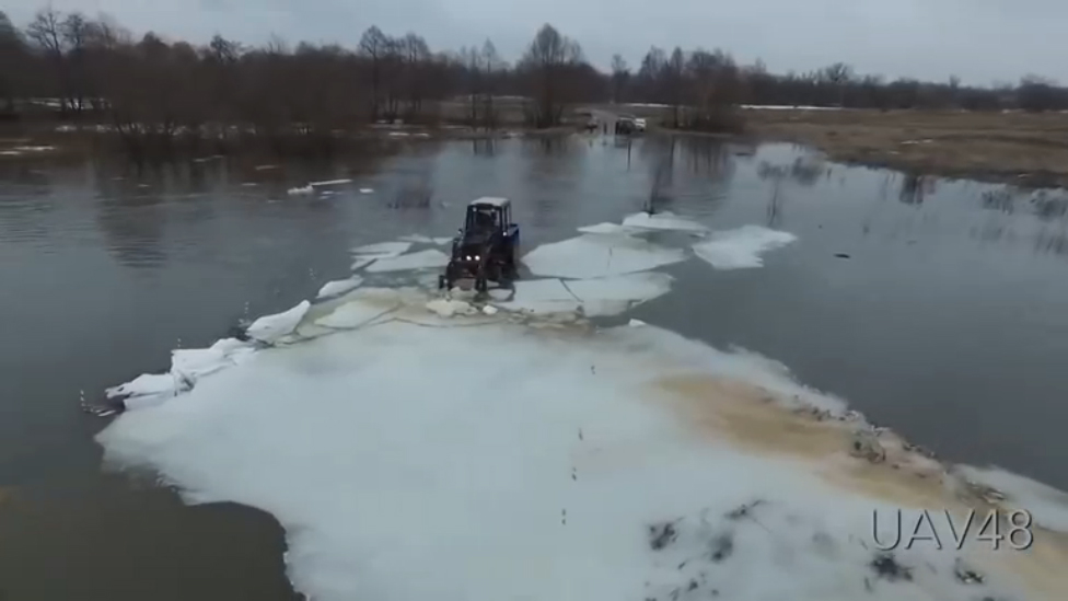 В селе Преображеновка Липецкой области 10 марта 2016 года местные жители превратили трактор в ледокол для расчистки затопленной и подмерзшей дороги.
