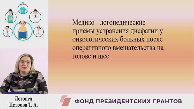 Медико - логопедические приёмы устранения дисфагии у онкологических больных после оперативного вмешательства на голове и шее. Логопед отделения опухолей головы и шеи медицинской реабилитации в НМИЦ Онкологии им. Н.Н. Блохина Петрова Татьяна Анатольевна