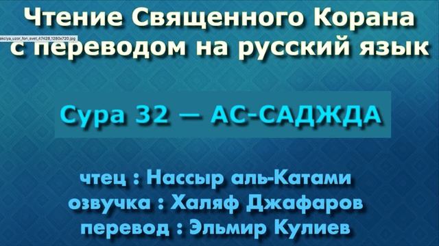 Кира'ат/Чтение с озвучкой Корана Чтец: Насир аль-Катами Озвучка: Халяф Джафаров Перевод: Эльмир Кулиев Источник YouTube канал: " Священный Коран "