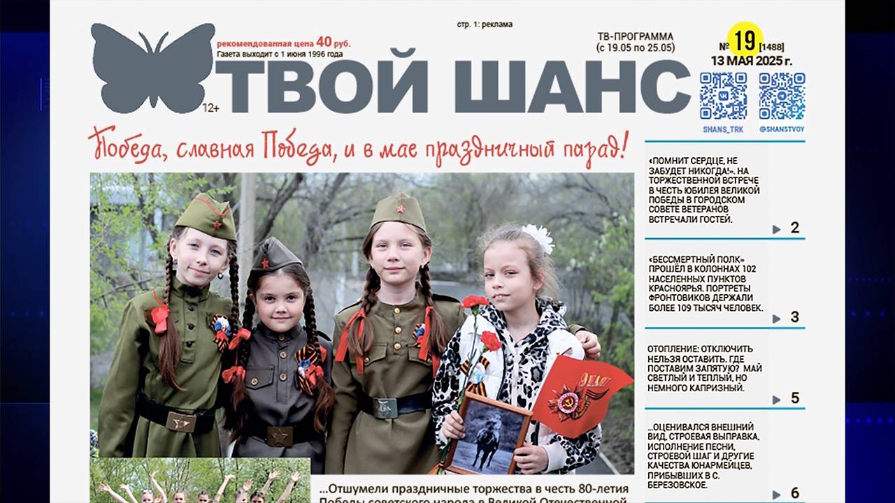 Садовые сообщества получал поддержку – собрали для вас важные краевые новости (3). Как встретили 9 мая в селе малое озеро (7). Как защититься от обмана при интернет-покупках (8). Как шарыповские учителя воевали на фронте (18). Фоторепортаж с празднования Дня Победы в поселке Дубинино (21). Как всегда, свежие вакансии, объявления недвижимости, сканворд, гороскоп и конечно телепрограмма – всё это вы найдете в еженедельнике «Твой Шанс»!