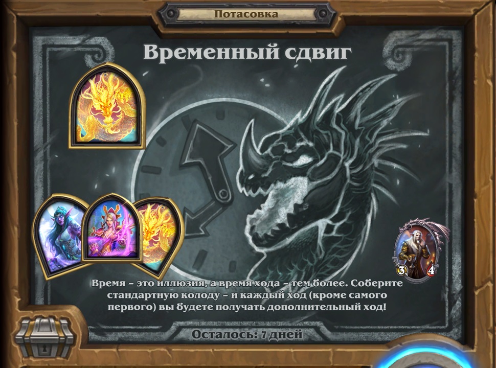 Потасовка в Hearthstone, в период с 20.07.2022 - 27.07.2022 Потасовка: Временный сдвиг Время - это иллюзия, а время хода - тем более. Соберите стандартную колоду - и каждый ход (Кроме самого первого) вы будете получать дополнительный ход! Код колоды: AAECAf3VAwqL5wPQ7APB8AOu9wP0/AOUgQT1ogT7ogTbuQSX7wQPp/cDio0E/J4E/Z4E/p4E558E6J8ExKAExaAE+qwEh7cElrcE8NME8dME26EFAA==