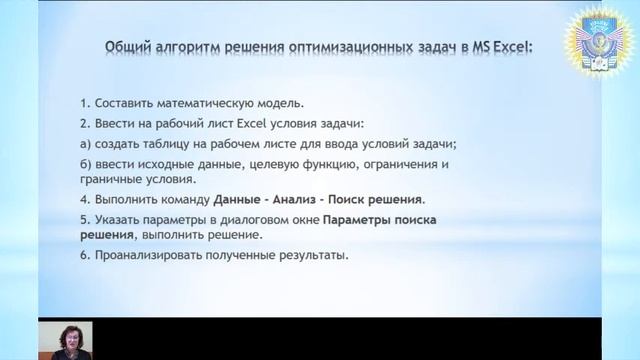 Цель лекции состоит в изучении MS EXCEL использование надстройки «поиск решения». Лекцию читает: Давидчук Н.Н., д.э.н., доцент кафедры информационных систем и технологий управления Официальный сайт ДонНУЭТ: http://donnuet.education