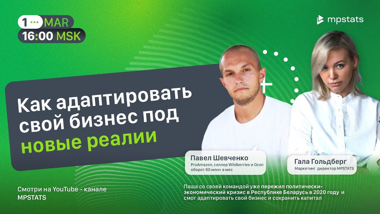 Мы видим, что тревога в бизнес-среде сейчас растет. Эфир будет не про политику. А про то, что нужно делать для сохранения своего бизнеса сейчас. Оставайся с нами, если хочешь узнать: Какие действия стоит предпринять в первую очередь Как управлять ценой и отстраиваться от конкурентов для сохранения рентабельности бизнеса Какие есть модели поведения потребителей в кризисной ситуации Спикеры: Павел Шевченко, ProAmazon, селлер Wildberries и Ozon оборот 80 млн+ в мес Гала Гольдберг, маркетинг директор MPSTATS Подписывайтесь на соцсети Павла: https://t.me/+vwHNcCdr7g1iMTI6 https://www.instagram.com/pavel_shauchenka/ https://www.youtube.com/channel/UCTH4rKDFwSVVaqM2YIn80Vw/ Запишись на демонстрацию сервиса аналитики маркетплейсов MPSTATS и попробуй его бесплатно ⇢ https://clck.ru/akcdq ✅ Интересует полное или точечное сопровождение на маркетплейсах? Ты можешь выбрать SEO-оптимизацию карточек, ведение ЛК или аудит твоего бренда⚡️ Заполни форму для связи с менеджером, и он ответит на любые твои вопросы ⇢ https://clck.ru/aoFkK ✅Узнай больше о возможностях сервиса: В чат-боте ⇢ http://mpstats.me/?utm_source=youtube На сайте ⇢ http://mpstats.io/?utm_source=youtube А ещё тебя ждёт Крупнейший форум страны по маркетплейсам MPSTATS CONF 2022 Более 1.500 участников в офлайн и еще более 10.000 в онлайн объединятся и встретят ТОПовых продавцов главных маркетплейсов России: Wildberries, Ozon, AliExpress, YandexMarket и SberMegaMarket Переходи, чтобы узнать подробности и выбрать билет https://clck.ru/cQ3dr ✅Подписывайся на наши соцсети и будь в курсе всех новостей и обновлений: Мы в VK ⇢ https://vk.com/mpstatsio Наш Instagram ⇢ https://www.instagram.com/mpstats.io/ Telegram-канал ⇢ https://telegram.me/analyticsmpstats Facebook ⇢ https://www.facebook.com/mpstats.io/