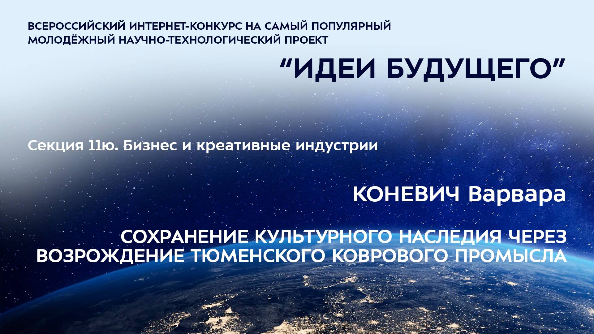 (11Ю-10) КОНЕВИЧ Варвара Ивановна Тюменская область, г. Тюмень МАОУ СОШ № 65 г. Тюмени, 6 класс СОХРАНЕНИЕ КУЛЬТУРНОГО НАСЛЕДИЯ ЧЕРЕЗ ВОЗРОЖДЕНИЕ ТЮМЕНСКОГО КОВРОВОГО ПРОМЫСЛА Научный руководитель: Серёдкина Тамара Владимировна, Тюменская область, г. Тюмень, МАОУ СОШ № 65 города Тюмени, учитель начальных классов высшей квалификационной категории Более подробно о мероприятиях Программы "Шаг в будущее" можно узнать на сайтах http://www.step-into-the-future.ru/ и http://шагвбудущее.рф