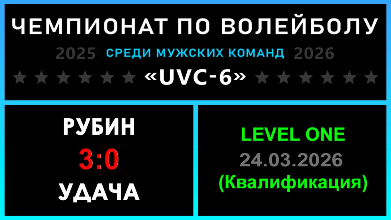 UVC-6 (Мужчины): Чемпионат UVC Лиги по волейболу среди мужских команд 2025-2026 гг. Результаты игры: LEVEL ONE (Квалификация) 24.03.2026 Рубин - Удача 3:0 (25:22, 25:18, 25:18) Рубин немного буксовал в первой партии (4 темпа на площадке, это конечно сильно 😅), но оставшиеся две партии для него прошли без проблем! Рубин продолжит борьбу в LEVEL ONE, а Удача отправляется в LEVEL HOPE! «Nostradamus trophy» - конкурс для участников группы ВКонтакте: ✅ 29 - количество участников, которые смогли предсказать точный исход матча! #UVC_ЛИГА_ЧЕМПИОНАТ_UVC_6_Мужчины