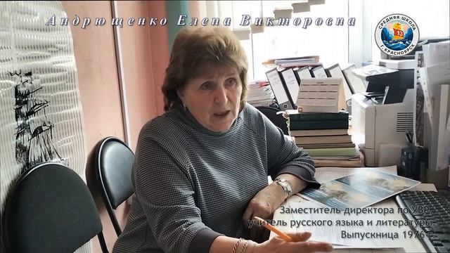 Интервью Андрющенко Е.В., заместителя директора по УВР, учителя русского языка и литературы, выпускницы 1976 г., в рамках реализации проекта "Наши учителя- выпускники школы", посвященного празднованию 80-летия МБОУ СШ №13.